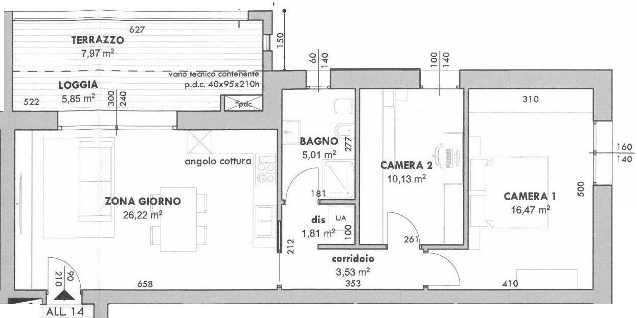 Al terzo ed ultimo piano ascensorato, appartamento 2 camere , composto da soggiorno pranzo, bellissima terrazza abitabile di quasi 14 mq, disimpegno, 2 ampie camere, antibagno con attacchi per lavatrice, bagno, garage e posto auto.